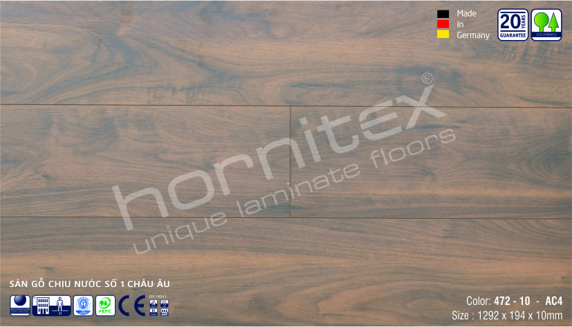 Sàn gỗ Hornitex 472-10 bản dày 10mm thuộc dòng “sàn gỗ công nghiệp cao cấp” không sợ nước,nhập khẩu CHLB Đức, công nghệ sản xuất hiện đại nhất thế giới, thách thức mọi điều kiện khí hậu thời tiết nóng ẩm với khả năng chịu nước đáng kinh ngạc, vân gỗ tự nhiên 3D, bề mặt sần, thớ gỗ đanh chắc.