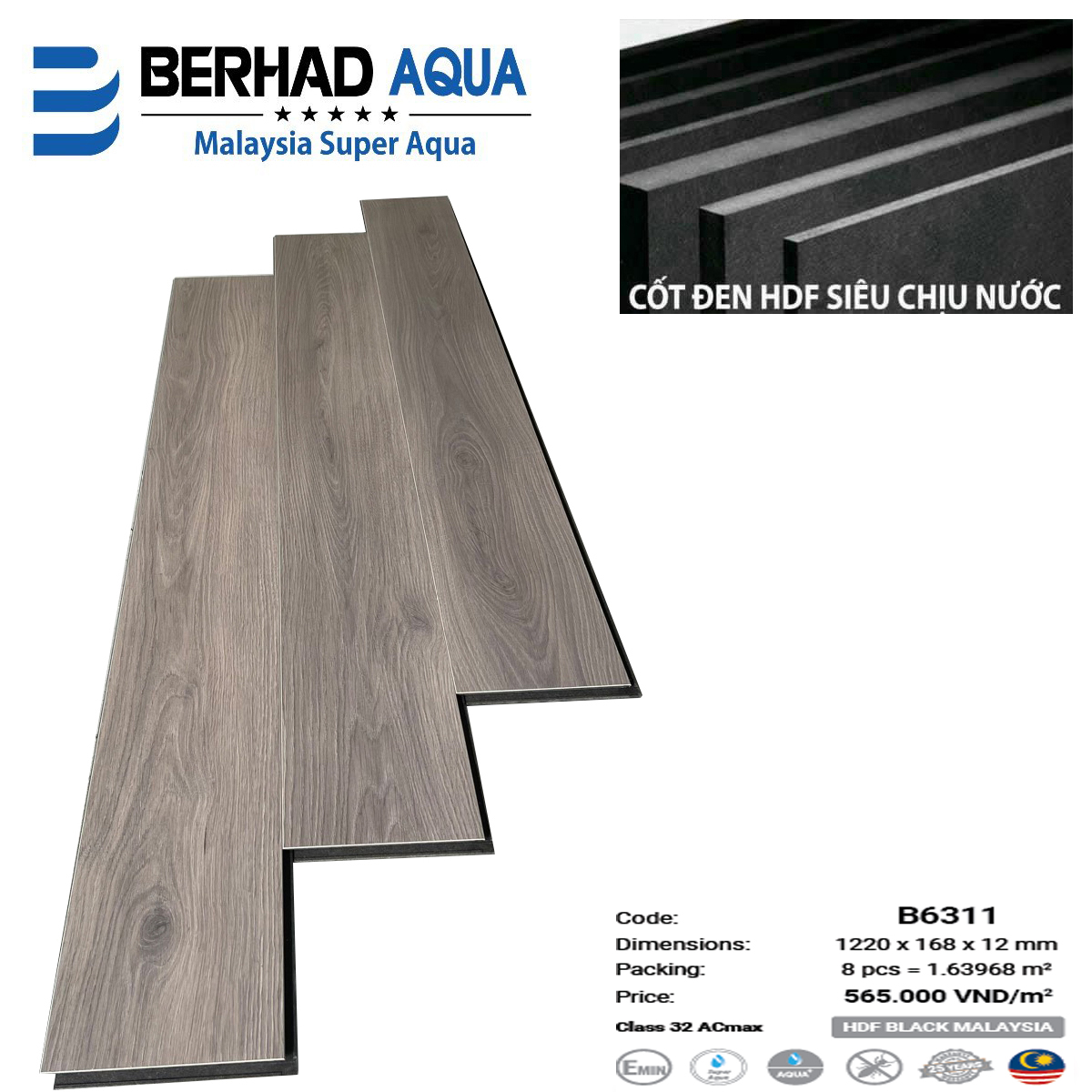 Sàn gỗ Berhad Aqua sở hữu chất liệu bền bỉ có xuất xứ từ Malaysia, từ lớp giấy bề mặt sần theo vân chống ẩm cho đến thiết kế đế sàn cứng cáp đảm bảo cách nhiệt và kháng ẩm thẩm thấu từ dưới nền đất, đem đến không gian sống hiện đại hài hòa.