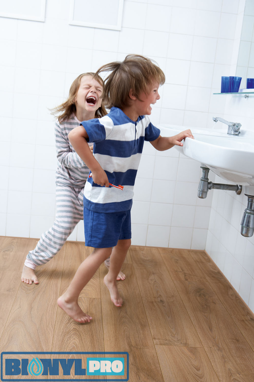 (Công nghệ O.R.C.A của Binyl Pro giúp sàn gỗ nhập khẩu này có thể lắp đặt đươc cả trong phòng tắm)