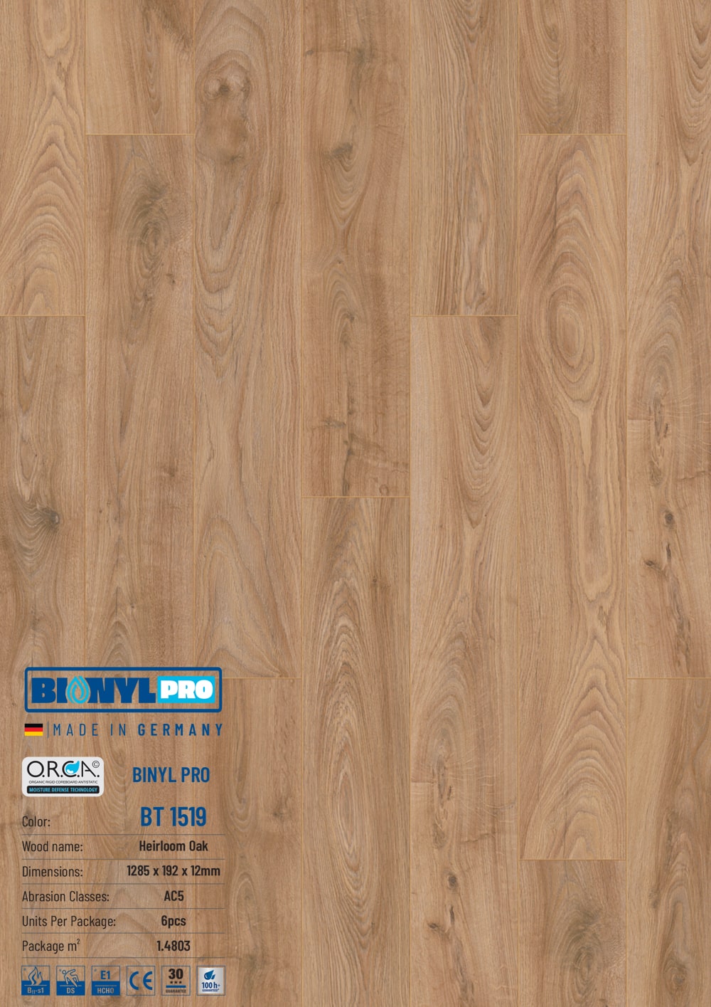 Sàn gỗ Binyl Pro 12mm BT1519 là dòng được coi là có sức chịu nước tốt nhất được các chuyên gia test thử trong 100 giờ, với mong muốn mang sản phẩm sàn gỗ chất lượng tốt nhất tới người dùng Việt Nam, Ngoài việc có độ bền cao thì sàn gỗ Binyl phải đảm bảo sức khỏe người dùng tốt nhất có thể.