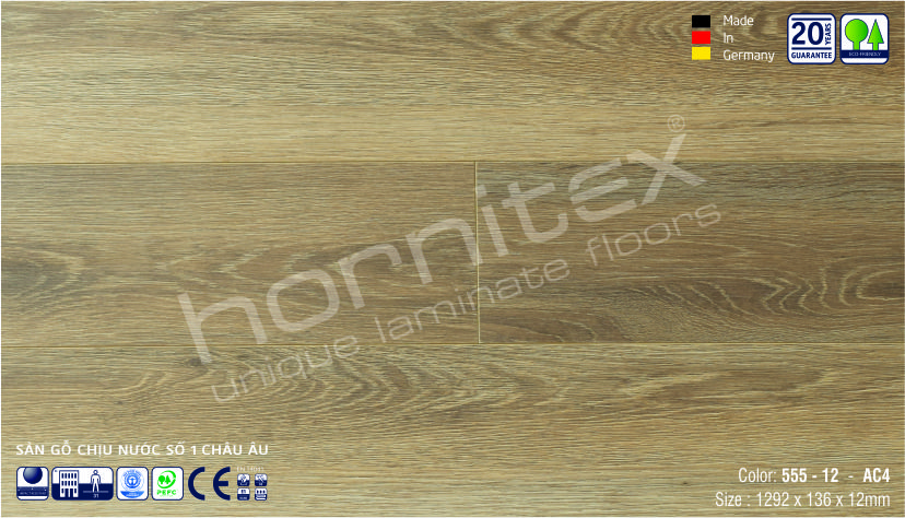 Sàn gỗ Hornitex 555-12 bản dày 12mm thuộc dòng “sàn gỗ công nghiệp cao cấp” không sợ nước