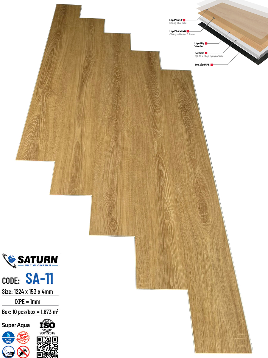 - Sàn nhựa hèm khóa Saturn SPC tích hợp sẵn đế IXPE là dòng sàn nhựa cao cấp với thiết kế dạng vân gỗ chân thực mang đến sự sang trọng cho không gian. Sản phẩm có khả năng chống cong vênh, nấm mốc, chống nước là lựa chọn cho những sàn nơi mà hay có tiếp xúc với nước, ẩm ướt hoặc công trình yêu cầu độ bền cao.