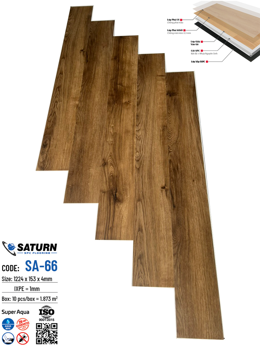 - Sàn nhựa hèm khóa Saturn SPC tích hợp sẵn đế IXPE là dòng sàn nhựa cao cấp với thiết kế dạng vân gỗ chân thực mang đến sự sang trọng cho không gian. Sản phẩm có khả năng chống cong vênh, nấm mốc, chống nước là lựa chọn cho những sàn nơi mà hay có tiếp xúc với nước, ẩm ướt hoặc công trình yêu cầu độ bền cao.