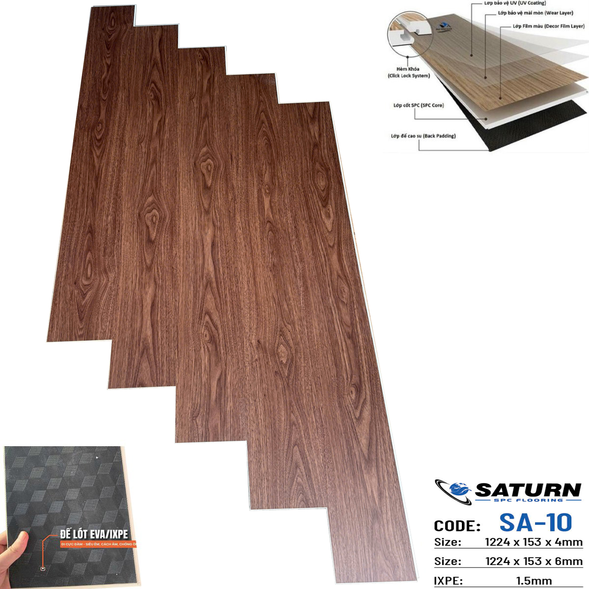 - Sàn nhựa hèm khóa Saturn SPC tích hợp sẵn đế IXPE là dòng sàn nhựa cao cấp với thiết kế dạng vân gỗ chân thực mang đến sự sang trọng cho không gian. Sản phẩm có khả năng chống cong vênh, nấm mốc, chống nước là lựa chọn cho những sàn nơi mà hay có tiếp xúc với nước, ẩm ướt hoặc công trình yêu cầu độ bền cao.